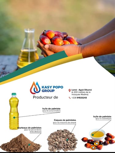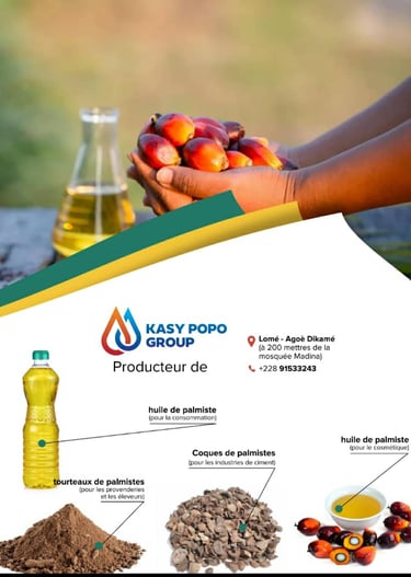 Co-Fondé par KLOUTSE Yaovi-Sédzro et AMEYAPO Koffi Selom, KASY POPO GROUP s'est rapidement imposé comme un acteur clé dans la valorisation des ressources agricoles de la région. Notre structure est spécialisée dans l'extraction, la transformation et la commercialisation d'oléagineux essentiels et de leurs co-produits.